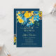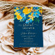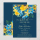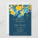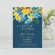 Um elegante, rústico primavera e girassóis amarelos de verão, rosas azuis e verde deixa chá de panela floral de aquarela com e elegante pincel de guiamento sobre fundo azul editável escuro. Perfeito para uma noiva de menina, na moda, ser celebrada!