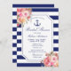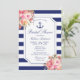Este cartão de chá de panela floral com tema náutico apresenta rosas de aquarelas bonito em tons de coral, cor-de-rosa e pêssego, acentuados por uma ancoragem azul marinho detalhada com corda e um fundo listrado azul e branco. Personalize seus detalhes de celebração em tipografia azul marinho em branco com uma borda em forma de bilhete. Desenhado pela artista ©Susan Coffey.