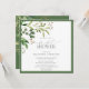 Chá de panela quadrado moderno, elegante, com folhas botânicas verdes e eucalipto, cor-de-rosa, e bordado em verde-oliva. Personalize os detalhes do seu chá de panela em preto suave, acentuado com uma bela caligrafia manual moderna. A parte traseira da placa apresenta os produtos de cor d'água botânicos sobre a textura verde. Copyright Elegant Invites, todos os direitos reservados.