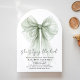 Chá de panela encantador em forma de arco com uma bela aquarela de um grande arco verde de coquete, "ela é casando" em um roteiro de chic, e o nome da noiva e os detalhes do chá em caracteres simples e modernos.