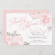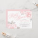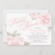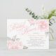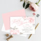 Design de chá de panela de casamento elegante e romântico apresenta "Chá de panela" no escrevendo de script, e informações personalizadas de blush e cinza de peão enquadradas por uma borda de rosas cor-de-rosa macia com folhas verdes / cinzas. Flores têm uma bela aparência pintada de aquarela.