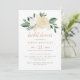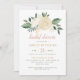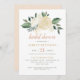 Os convites de chá de panela de casamento clássicos apresentam um elegante design de aquarela floral com rosas pintados, flores ranunculus e folhas em primavera neutro e tons de verão de branco, creme, rosa-pincel, ouro e verde. A parte traseira da placa está penteada com o padrão de ponto escovado com abstrato.