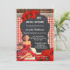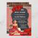 Um chá de panela romântico com tema de CHURRASCO, com madeira rústica, quadro-negro, pintura vintage de uma mulher de vestido vermelho, flores de papoila e rendas sobre fundo de gingham. O dorso é uma combinação de madeira rústica com rendas em um padrão vermelho e marfim de gingham.
