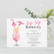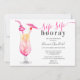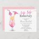 Sip Sip Hooray! Celebrar seu chá de panela ou suas meninas a noite fora com esta ilustração engraçada e fofa de um copo de cocktail tropical com aquarela rosa, flamingo, cereja e guarda-chuva e uma letra elegante num layout horizontal num fundo branco editável.