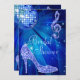 Convites de chá de panela personalizados e elegantes. Bonitos convites de dois lados, azuis e brancos, para chás de panela com uma bola de espelho retrovisor retro divertida, glamorosa imagem impressa, brilho de rotinas, sequências, joias de borda brilham calçados de saltos altos e letras de salto alto, e notas musicais brilhantes/notas musicais com brilhos em um fundo azul vibrante e cintilações. Chic, clássico, fofo, giro, convites modernos com cores modernas e modernas. Estes convites, na moda, sofisticados, divertidos e bonito são decorados/impressos em ambos os lados. Convites perfeitos para um evento de dança jante/dança noturna. NOTA: todos os convites no Zazzle têm imagens impressas planas. Se precisar de assistência para personalizar seu produto, entre em contato comigo através da minha loja e eu ficarei feliz em ajudar.