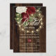 Chic do campo, iluminado com falso, coroa floral adornada com ricas, esbranquiçadas e vermelhas escuras a arrojadas, design de "Chá de panela" floral luxuoso em um fundo de madeira falsa manchada com escuridão. Esta design rusticascompósita de madeira feita por Designs Holiday Hearts (direitos reservados).
