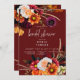 Este design de convite para chá de casamento de apresenta um tema escuro e moderno que é simples, mas espantoso. Um fundo de ferrugem escuro é a canvas perfeita para buquês de canto de flores coloridas de queda realistas. Mães de laranja queimadas, peônias de burlagem, rosas cor-de-rosa pinceladas, flores de creme, gramíneas secas, palitos e folhagem verde-escura. Vibrante e rico em cores, esse convite pode ser usado no final do verão ou no outono. Criado pela imprensa simplesmente de farmácia.