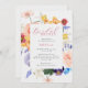 Um convite elegante para o seu brunch de noiva apresenta um quadro de flores de aquarela em tons de pêssego, rosa, roxo e amarelo. Personalize todos os detalhes importantes, como nome da noiva, data do chá, local e informações do registro. Perfeito para sua festa de jardim ao ar livre inspirou festa.