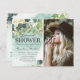 Convites de chá de panela de fotos elegantes, com lavagem a cores esverdeada/azul esverdeada, folhas botânicas verdes elegantes, pedaços de folha de ouro falsa, uma foto da noiva e um simples modelo de chá de panela que é fácil de personalizar.