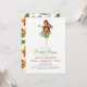 O Havaiano Luau temia chá de panela. O convite apresenta dançarina de hula e padrão de flores tropicais atrás.