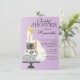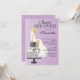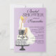 Comece seu chá de panela elegante com nossa tenda chá de panela loira apresentando uma noiva loura de classe sentada em um bolo de noiva de na moda, de 3 níveis, em um fundo roxo. Personalize nosso convite com suas informações de chá de casamento e você está pronto para ir. ©JW Ilustrations