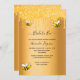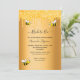 Elegante, divertido, chá de panela de verão. Um fundo dourado falso e dourado falso pinga. Decorado com mamangabas felizes sorrindo. Com o texto: Bride to Bee o nome da noiva a ser escrita com um moderno estilo escrito à mão. Letras negras.