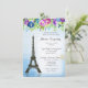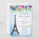A sensação macia, romântica com torre Eiffel contra um fundo azul pastel e um pop brilhante da aguarela florescem a dança através da parte superior. Original, fresco e moderno com primavera colorido floresce. Azuis, roxos, verdes, e um respingo do vermelho - aperfeiçoe para o casamento temático francês ou francês. Edite facilmente para seu próprio convite do chá de panela ou do casamento. Apresente seus convites no estilo!