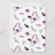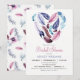 Chá de panela de penas roxa, rosa e violeta. Convidam penas em forma de coração na frente, com padrão personalizado atrás.