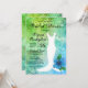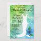 Um vestido de noiva de cauda de sereia com um hibisco azul em uma escala de sereia gradiente mostra como fundo este design de Chá de panela é perfeito para sua celebração temática na praia. Design por Holiday Hearts Design (direitos reservados).