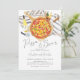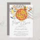pizza casual divertida e chá de panela de cerveja apresentando uma pizza em uma casca de pizza com garrafas de cerveja e vinho em uma mesa esticada neutra e listra branca. Disponível no nosso compro para um janto de noivado e ensaio.