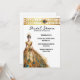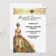 Uma bela pluma de penas de ouro de pavão repousa sobre uma banda branca revestida de ouro e tem espirais decorativas de ambos os lados. Abaixo da banda estão modelos pretas personalizadas e uma bela noiva vestindo um vestido de noiva ouro feito de seda fina e penas de pavão. Ela está vestindo uma tiara de ouro falsa na cabeça e pop contra o fundo branco estrelado. Este convite "chá de panela" é ideal para qualquer evento muçulmano, islâmico, hindu, hindu, indiano; natureza, ave ou ao ar livre.
