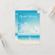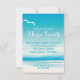 Tema de Casamento de Praia. Linda praia tropical costeira arenosa com mar e ondas caindo do oceano verde, pôr do sol (ou nascer do sol), palmeira branca e gaivota estilizada. Casual ou formal, para um casamento na praia ou num casamento na ilha de destino - Isto é parte de uma suíte de casamento completa com papelaria de casamento complementar encontrada em The Barefoot Bride http://zazzle.com/TheBarefootBride