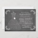 chá de panela moderno único com um vestido branco de noiva num cabide armado com um belo quadro elegante em folha, colocado sobre um fundo preto em forma de quadro negro. O vestido de noiva tem as palavras "aqui vem a noiva" escritas nela e uma flor na cintura. Sacudir o convite para encontrar um quadro correspondente de volta para um toque especial extra. Na moda e contemporâneo, com um toque de convite de vestimenta bonito de noiva, está disponível em nosso compro em outras combinações de cores populares.