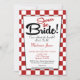 Um chá de panela retrorreflector vermelho e branco agudo com fundo vermelho e branco marcado para "Chá The Bride".
