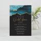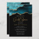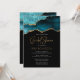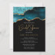 Este convite de aniversário de tendências apresenta uma imagem de aquarela de um geode agado em tons de azul lacrimejado, cortada com realces de brilho dourado falsos. As palavras "Chá de panela" aparecem na falsa brilha dourada em letra decorativa moderna de escrita manual. Personalize-o com o nome da noiva a ser na fonte de deco de arte dourada e os detalhes do chá no tipo de serifa sans branco em um plano de fundo preto. A mesma imagem de coleira aparece no lado oposto.