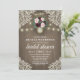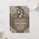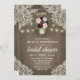 Convites de chá de panela Dourados Mason Jar, cor-de-rosa-azul-borrão - apresentam um fundo de madeira de celeiro rústico com rendas de marfim, luzes de cordas e um antigo pote de mason de ouro cheio de verde, eucalipto e rosas e peões em tons de burgundy e rosa-pincel. Mude as iniciais da demonstração no pote para você. Exibir a coleção correspondente nesta página para ver coordenando produtos.