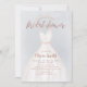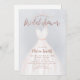 Os convites de chá de panela elegantes apresentam vestido branco de casamento com falso brilho rosa dourado escrito em chá de panela sobre fundo azul empoeirado