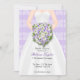 Chá de panela convida ... belo vestido de noiva com noiva segurando um buquê de Lilac e flores brancas em um fundo floral claro roxo e branco. convites de chá de panela de designer vêm completos com envelopes brancos... do original Ricaso artwork©delightful-doodles.com