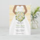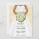 Chá de panela convida ... belo vestido de noiva com noiva segurando um buquê de flores amarelas e brancas em um fundo de padrão amarelo e branco ... convites de chá de panela designer vêm com envelopes brancos.. do original Ricaso artwork©delightful-doodles.com
