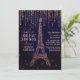 Este convite de festas de casamento elegante e moderno é perfeito para a na moda e a mulher de tendências. Representa uma glamourosa rosa dourada falso Paris Torre Eiffel em marinho azul e num fundo de cenários de cor da água de cor púrpura com estrelas brilhantes brilhantes de brilho e cordões brilhantes de brilho. Na parte de trás está o rico popular brilho rosa de ouro Paris, torre Eiffel, em uma marinho de moda azul, cor d'água e vinho, cor d'água púrpura, com estrelas. É mínimo, contemporâneo, chico, artístico e bonito!