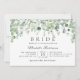 Este Chá de panela Botânico Eucalipto Greenery - apresenta uma esmagadora cascata verde de ucaliptos, folhas sobre fundo branco pálido com texto moderno de roteiro. O reverso do convite à noiva também é branco com folhas de eucalipto.