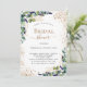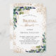 Bem-vindo a um Chá de panela elegante. Um fundo branco chic. Decorados com folhas de eucalipto, prigos, verde, folhas de ouro falso e pó de ouro, de cor aquosa verde. Personalize e adicione o nome da noiva a ser e os detalhes da parte. Letras pretas e ouros.