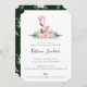 Elegante tema do flamingo tropical, chá de panela. design de placa, buquê de aquarela de flores, verde macio e flamingo rosa. O verso do cartão, mostrado em verde-caçador, pode ser personalizado.
