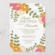 Comece seu chá de panela na moda com nosso chá de panela floral impressionante. Nosso convite para o chá de casamento de flores bonito apresenta belas mães cor-de-rosa, laranja e brancas e flores de zinnia com folhas verdes de feno colocadas sobre um fundo branco moderno e nítido com uma fonte verde. Convite floral perfeito para o seu chá de panela primavera, chá de panela de verão ou chá de panela de outono. Visite o nosso compro para ver este convite com várias cores e para lhe agradecer os cartões de nota, autocolantes e selos postais.