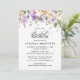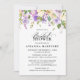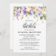 A caligrafia elegante e as bonito flores roxas e brancas de marfim criam este convite para chás de panela de aquarela.