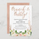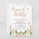 chá de panela em Brunch e espumante com um arranjo floral, na sua maioria branco e rosa, e posição de caligrafia em folha de rosa, vidro de champanhe e ramos.