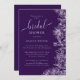 Chá de panela Floral de Pedras de Jewel Roxas Este convite apresenta flores desenhadas em branco e caligrafia personalizada. A cor do tom de joia roxa é o pano de fundo perfeito para este convite.