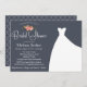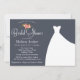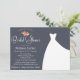Casamento ou Chá de panela, com buquê floral elegante e um lindo vestido de noiva sobre um fundo azul marinho com flores cor-de-rosa de pêssego.