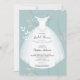 Chá de panela moderno de noiva com um lindo vestido branco de noiva colocado sobre um fundo azul verde. Sacudir o convite para o chá de vestimenta de chic e na moda para ver uma floral de cor d'água correspondente para um toque especial extra. Convidar chá de panela contemporâneo para um chá de panela, chá de panela de verão, chá de panela de outono ou chá de panela de inverno. Visite nosso compro para ver esta design popular de noiva em várias cores.