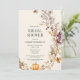 Celebre seu evento com esses Convites de chá de panela Florais de Pumpkin Boho de Queda elegantes. Apresentando uma abóbora laranja, lindas flores silvestres, borboletas e fundo na mostarda amarela, esbranquiçada, roxa e verde. Todo o texto pode ser alterado.