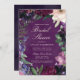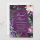 Flores românticas em tons de robusto rico, lilás suave, berinjela profundo, coroa roxa e rosada com botânicos verdes modernos, como samambaias e eucalipto. Um fundo profundo e roxo de aquarela gravatas tudo junto com a tipografia elegante nestes convites de chá de panela românticos.