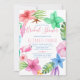 Praia do oceano moderno estilo havaiano pastel aquarela modelo convite de festas floral chá de panela com flores coloridas de hibisco com folhas tropicais, estrela do mar e pássaro flamingo rosa. Uma aquarela lavou fundo rosa azulado no reverso. +++++++++++++++ O convite é adequado para aloha, litoral, oceano, praia, chá de panela de destino, lua ou festas de lanche.