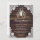 Chá de panela floral russo com bafo de bebê, lanterna e lanterna em um fundo de madeira rústica adornado com um rendas floral branco. Personalize facilmente este chá de panela floral rústico e giro para complementar seu país rústico, ou festa de casamento de celeiro.