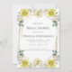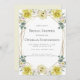 CHÁ DE PANELA DE CASAMENTO | Formas geométricas com peônia amarela ensolarada e flores de magnólia - uma estrutura de tipo terrário multifacetada e geométrica dourada adornada com arranjo botânico. O reverso é uma cor complementar coordenada. Personalizar texto, estilo de fonte, cor e tamanho. Arte original criada para o BarefootBride™ por © WhimsicalArtwork™ - Esta é parte de um Conjunto completo de Artes de Casamento, chá de fraldas e outros artigos de papelaria para eventos semelhantes.