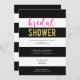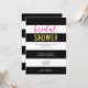 Este chá de panela moderno e divertido apresenta um fundo listrado preto-e-branco com texto cursivo rosa-quente e texto falso brilhante.