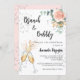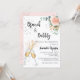 Um convite moderno, na moda e glamouroso para um Chá de panela de bolinho. Um fundo branco com bolhas, um par de flautas, óculos, uma flor de ouro rosa e um verde de eucalipto. O nome é escrito com um moderno estilo escrito à mão. Personalize e adicione os detalhes da sua festa.