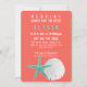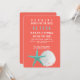 Convites de chá de panela de praia tropical. Laranja-coral brilhante e azul-azul-turquesa, com texto tipográfico branco. Um grande peixe-estrela e um dólar de areia decoram o fundo para representar o casal. O nome da noiva é impresso em turquesa para se destacar. Adicione espaços entre as letras do nome dela, se preferir. Incluir informações do registro e/ou um site de casamento.