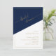 Faça uma impressão duradoura com nosso Chá de panela Azul e Geométrico Dourado. Este sofisticado design apresenta um padrão geométrico ousado em azul marinho profundo e branco nítido, criando um pano de fundo contemporâneo e na moda para sua celebração. A frase do "chá de panela" é mostrada elegantemente em um roteiro dourado em shimmering contra um fundo azul marinho diagonal impressionante, adicionando um toque de opulência e refinamento. Personalize este convite refinado com os detalhes do evento, incluindo o nome, data, local e informações de RSVP da noiva. Esses detalhes são mostrados dentro de uma linha de borda luxuosa de estrutura de ouro, combinada com a coordenação de sans serif e serif douradas em um fundo branco diagonal em negrito. A combinação do rico marinho azul, sotaque dourado e design geométrico torna este convite perfeito para um chá de panela moderno e elegante.