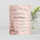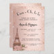 Um convite moderno, na moda e glamouroso para um tema chá de panela e parisiense. Um fundo metálico rosa dourado falso com brilhos falsos e a torre Eiffel com algumas flores. O nome é escrito com um moderno estilo escrito à mão. Personalize e adicione um nome e detalhes da parte.