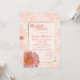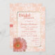 Pessegueiro elegante e chá de panela de damasco branco, com gráficos de uma área de texto enquadrada de tom dourado, no meio, e uma margarida Gerber colorida de pêssego bonito, no canto inferior esquerdo. O texto em pêssego é totalmente personalizável e pronto para personalizar seu evento noivo. Belo convite para a noiva ser amada.